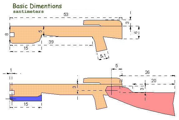 Material used for stock is Birch. The best material is the fiberglass, but I have not found a suitable piece of it. So, the first bow was made from some unknown plastic, found in the garage. It was 65 cm long and has about 37 kg draw weight. All was OK for some weeks, but then it got a terrible string follow. My current prod is made the next way: I took an old slalom ski, sawed back part of it, then cut it lengthwise. Thus I got limbs and mounted them on central section with long bolts. So I got a prod which is longer than normal, but it works well, and does not have any string follow. It's draw weight is about 43 kg.