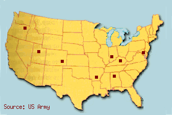 The chemical stockpile within the continental United States is divided among eight storage facilities. A ninth facility is in the Pacific.
