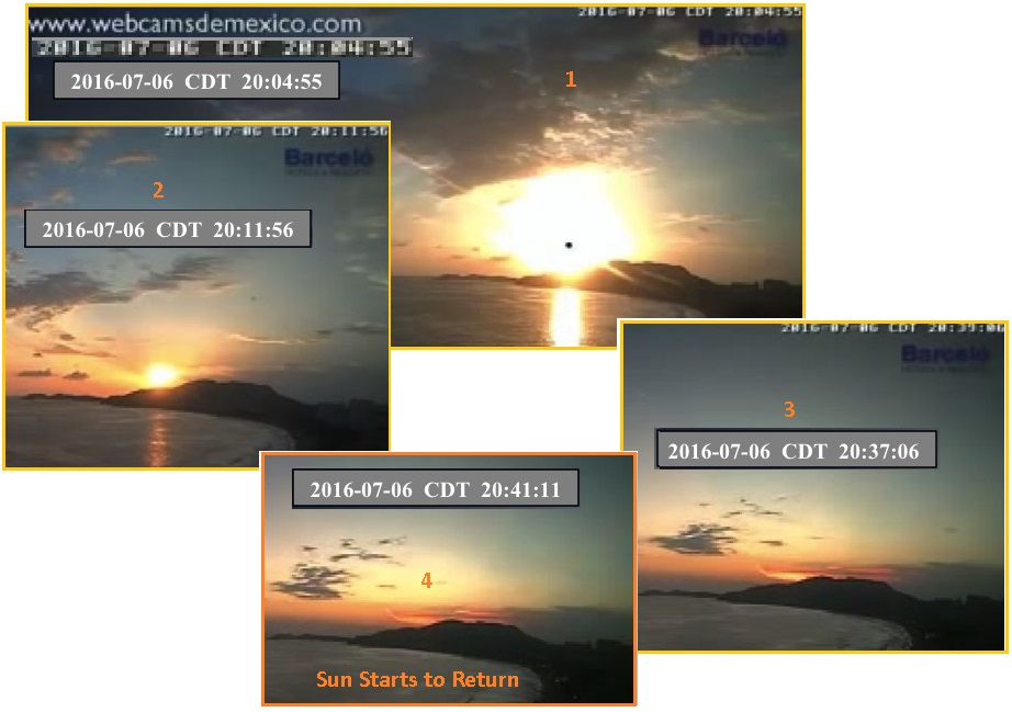 Now we are seeing this phenomena while looking West at the setting Sun, also from a Mexican webcam. As documented on the Pole Shift ning blog, on July 6, 2016 the Sun sets and then rises again briefly to set again, this time a tad further to the South. This is completely in accordance with prior documentation and the Figure 8 wobble, which is pushing the N Pole of Earth further North and up over the horizon at that time. This moved the second sunset to the South, and also accounts for the visibility of the re-appearing sunset at that time. The Earth is fatter at the Equator, so viewing the Sun from a position further North provides a view above this fat middle.