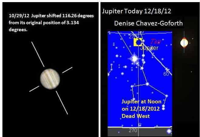 Since March, 2003 Jupiter has shown itself vulnerable to the magnetic blast coming from the N Pole of Planet X. At that time, Planet X was just entering the inner solar system and was pointing its N Pole toward the Sun’s S Pole, going end-to-end with the Sun. This was a direct tilt in the direction of Jupiter, which reacted by a tilt itself. Both Jupiter and Saturn are in magnetic opposition  to the Sun, which means they are allowing magnetons to flow in their tops and out their bottoms. They themselves are not magnetic planets, and do not generate a magnetic field. By being in opposition, they merely present the least resistance to the flow of magnetons in the Sun’s field.
