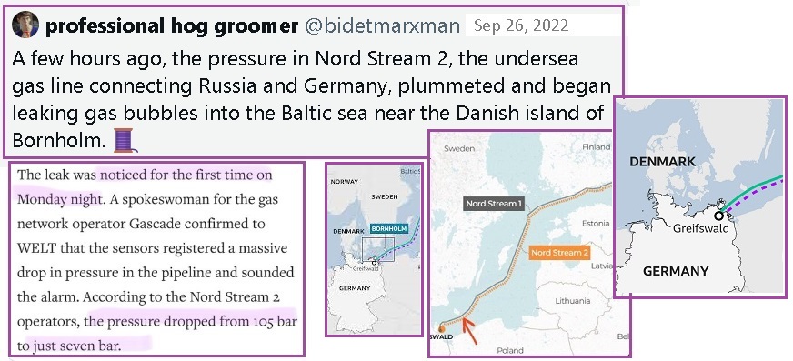 European countries on Tuesday raced to investigate unexplained leaks in two Russian gas pipelines running under the Baltic Sea near Sweden and Denmark, infrastructure at the heart of an energy crisis since Russia’s invasion of Ukraine. Experts and also Russia, which built the network, said the possibility of sabotage could not be ruled out. Was it deliberate damage? What do the Zetas say? [and from another] https://cnn.com/2022/09/02/energy/nord-stream-1-pipeline-turned-off/index.html [and from another] https://cnn.com/2022/09/05/energy/energy-crisis-russia-europe-costs/index.html [and from another] https://www.cnn.com/2022/09/27/energy/nord-stream-pipeline-leaks/index.html [and from another] https://www.godlikeproductions.com/forum1/message5242302/pg1 [and from another] Huge Pressure Leaks hit Undersea Nord Stream Pipelines September 26, 2022 https://www.politico.eu/article/gas-leak-detected-near-nord-stream-2/ Three Russia-to-Germany pipelines running under the Baltic Sea reported massive pressure falls. Two of the leaks were near the double Nord Stream 1 pipeline, to the northeast of Denmark's Bornholm island, and one leak was reported near the Nord Stream 2 pipeline off the southeastern coast of the island. [and from another] Large Underwater Observatory Disappears Without a Trace, Baffling Scientists September 5, 2019 https://gizmodo.com/large-underwater-observatory-disappears-without-a-trace-1837897180 The Boknis Eck Observatory is—or at least was—located at the outlet of Eckernförde Bay, which is north of Kiel, Germany and south of the Danish border. It was 1.8 kilometers (1.1 miles) off shore, planted at a depth of 22 meters (72 feet), reported the BBC.