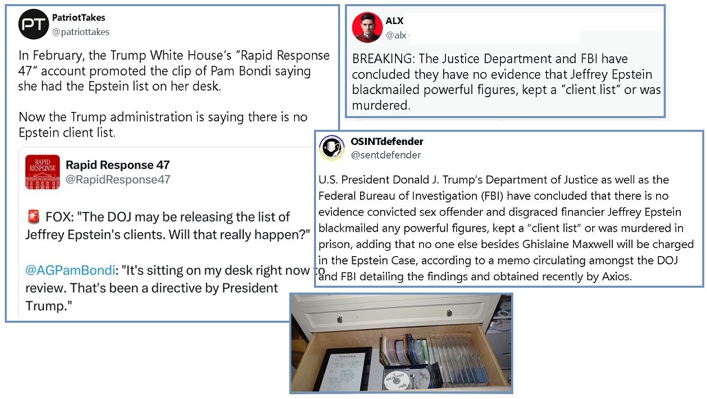Надежда на то, что Бонди, Патель и президент Трамп обнародуют долгожданные подробности о списке клиентов Эпштейна, внезапно рухнула, когда Министерство юстиции опубликовало меморандум, в котором отрицается существование такого списка. Общественность видела журналы регистрации полётов и фотографии клиентов, таких как принц Эндрюс и Билл Клинтон, с Максвеллом, но доказательств сексуальной активности с маленькими детьми нет. Одной из причин является засекреченность судебных протоколов для защиты маленьких детей или соблюдения условий сделок о признании вины со следователями, но недостающим элементом является «белая почта».