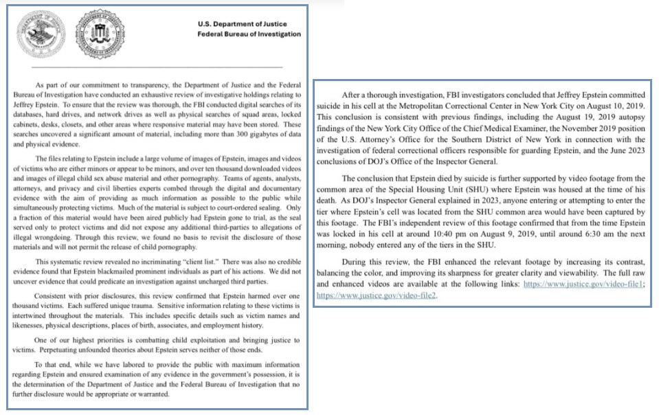Что случилось с Пателем и Бонди (или с кем-то ещё), из-за чего ФБР и Минюст солгали об Эпштейне. Никакого списка клиентов. Самоубийство в камере. Они говорят, что скрывают информацию, чтобы защитить жертв. Возможно, Эпштейн никогда не вёл список. Но другие (Максвелл) точно вели. Таким образом, они противоречат сами себе в своих отчётах. [и от другого] ЭКСКЛЮЗИВ: Министерство юстиции и ФБР пришли к выводу, что у них нет доказательств того, что Джеффри Эпштейн шантажировал влиятельных людей и вел список клиентов   https://www.godlikeproductions.com/forum1/message6031934/pg1 [и от другого] https://x.com/alx/status/1942029348875256109 [и от другого] От ФБР требуют обнародовать СОТНИ "Пропавших" документов Джеффри Эпштейна, включая кассеты, компакт-диски, паспорта и фотографии, изъятые из его особняка в Нью-Йорке стоимостью 51 миллион долларов На фоне подозрений, что Педо был связан с Моссадом 5 января 2024 года https://www.dailymail.co.uk/news/article-12930889/fbi-demanded-release-jeffrey-epstein-documents-names.html ФБР сталкивается с новыми призывами обнародовать сотни "пропавших" улик, изъятых из особняка Джеффри Эпштейна в Нью-Йорке стоимостью 51 миллион долларов после публикации нового списка его сообщников. Среди пропавших вещей — кассеты, компакт-диски, паспорта и фотографии, которые находились в сейфе в доме во время обыска в июле 2019 года, вскоре после ареста Эпштейна. Продолжают появляться слухи о том, что Эпштейн был агентом израильской разведки «Моссад» до своего самоубийства в ожидании суда за преступления сексуального характера в отношении несовершеннолетних. Эта информация породила слухи о том, что Эпштейн, возможно, проводил операцию по заманиванию в ловушку, чтобы получить ценные «компрометирующие» материалы для шантажа политических и деловых элит. Бывшие израильские шпионы официально заявили, что Эпштейна в шпионскую игру втянул отец Гислен Максвелл, Роберт Максвелл, которого Ари Бен-Менаше назвал агентом Моссада. Бен-Менаше работал в Управлении военной разведки Израиля с 1977 по 1987 год. [и от другого] Тайна окружает файлы Джеффри Эпштейна после того, как Бонди заявил о "Десятках тысяч" Видеозаписей 1 июля 2025 года https://apnews.com/article/justice-department-jeffrey-epstein-pam-bondi-trump-fa39193d5b5ff91970428bf077a5ce44 Преступления Эпштейна, громкие связи и самоубийство в тюрьме сделали это дело магнитом для сторонников теории заговора и онлайн-сыщиков, ищущих доказательства сокрытия. Илон Маск пришёл в ярость во время ожесточённого спора с Трампом, когда бездоказательно заявил в своём посте в социальной сети, который впоследствии был удалён, что документы Эпштейна до сих пор не обнародованы, потому что в них фигурирует президент-республиканец. В феврале в интервью телеканалу Fox News Бонди предположила, что предполагаемый «список клиентов» Эпштейна лежит у неё на столе. После этого Министерство юстиции разослало ультраправым инфлюенсерам в Белом доме папки с пометкой «несекретно», но вскоре стало ясно, что большая часть информации уже давно находится в открытом доступе. «Список клиентов» не был раскрыт, и нет никаких доказательств существования такого документа. [и от другого] Вуаль спадает 3 января 2016 г. http://www.zetatalk.com/russia/issue483.htm В 2015 году вуаль продолжала спадать с педофилов. Начиная с твёрдой решимости Папы Римского Франциска преследовать педофилов в церкви и заканчивая непрекращающимися разговорами о принудительном сексе с несовершеннолетними девочками со 