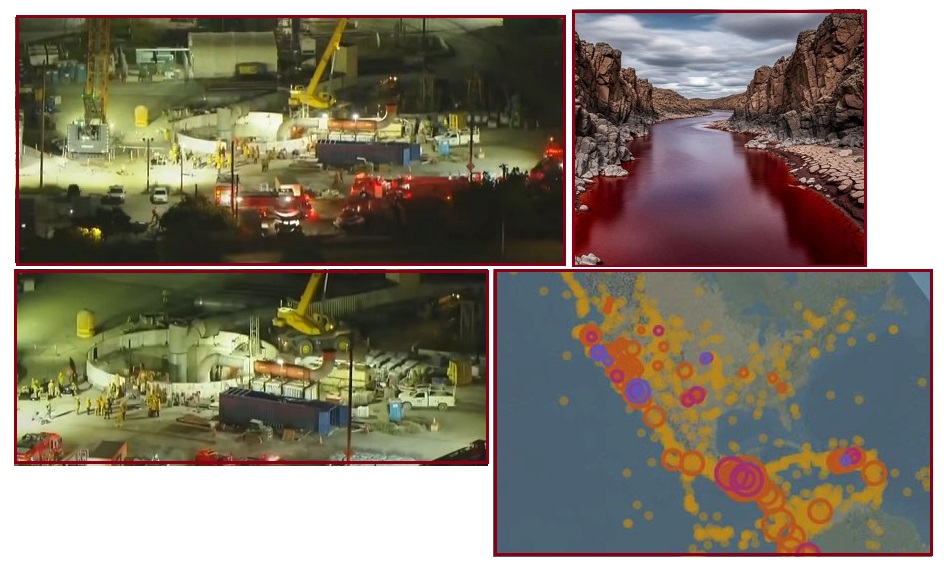 Обрушение туннеля для сточных вод в Лос-Анджелесе свидетельствует о том, что началось смещение разлома Сан-Андреас. В начале саги ZetaTalk в 2007 году мы предсказывали, что на Западном побережье произойдёт реакция на «Нью-Мадридскую корректировку». Это включает в себя землетрясения, извержения вулканов и прорыв плотины Гувера поскольку, по нашим прогнозам, её водосбросы будут забиты. Верховья реки Колорадо окрасились в кроваво-красный цвет из-за разрывающихся там пластов горных пород. Всё это свидетельствует о том, что Нью-Мадридская складчатость достигает Западного побережья.