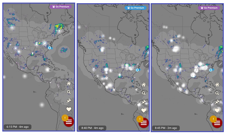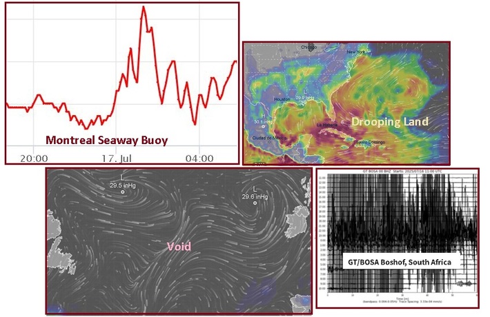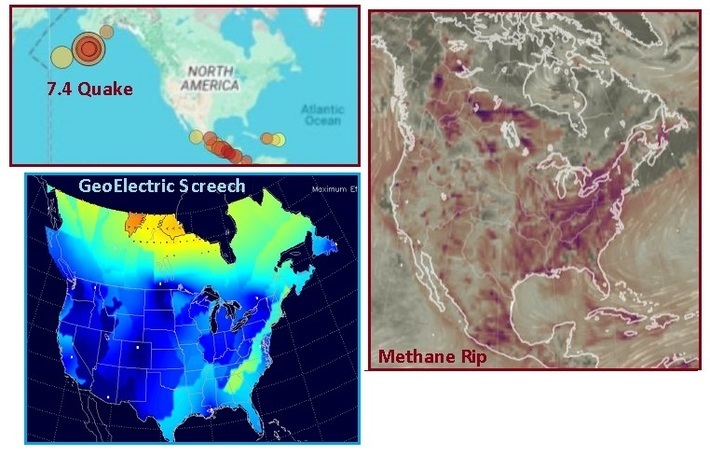 В течение последних 4 с лишним часов, 17 июля, я наблюдал и документировал необычную грозовую активность по всему миру. Я прикрепил серию снимков радара в реальном времени, сделанных с разницей в несколько минут. На последнем снимке видно, что в зоне разлома Нью-Мадрид спустя 4 с лишним часа после первого удара молнии всё ещё идёт гроза. Большинство этих ударов молнии произошли без каких-либо сопутствующих штормов или осадков. [и от другого] 17 июля все признаки указывают на то, что разлом Нью-Мадрид продолжает расширяться. На Алеутских островах произошло землетрясение магнитудой 7,4, вероятно, более сильное, поскольку Геологическая служба США уже несколько лет занижает магнитуду. Геоэлектрическая карта показывает, что граница тектонических плит в Арктике между Североамериканским континентом и Евразийской плитой испытывает напряжение и растягивается. Карта метана показывает, что юго-восточная часть растягивается до предела, как и территория к западу от реки Миссисипи, которая теперь находится над морским путём. Атлантический океан также раскалывается из-за того, что в районе Бездны магма нагревает Гольфстрим. Буй в проливе Монтерей показал резкий скачок, когда произошло землетрясение на Аляске, и «Гелиплоты» по всему миру тоже «зазвенели, как колокола». А там, где земля опускается и растягивается, вызывая ливни, атмосферное давление над этим прогибом падает.
