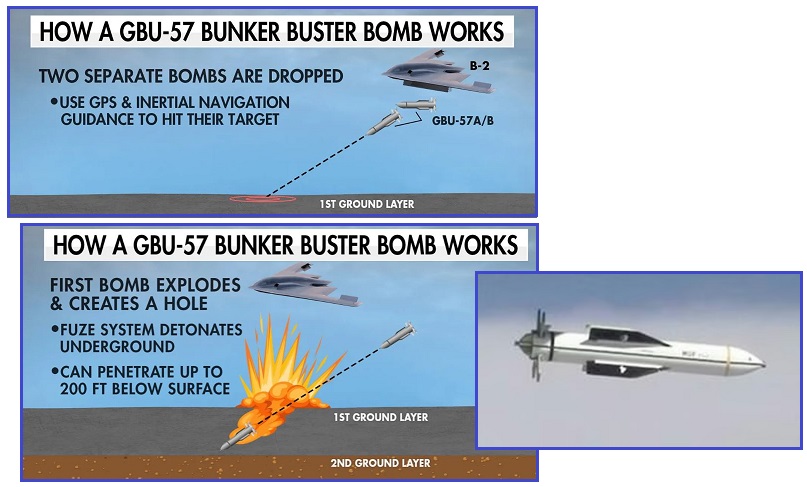 Бомбы-разрушители бункеров бывают разных весовых категорий. У Израиля есть бомбы весом 2000 и 5000 фунтов. Только у США есть 30-килограммовая противобункерная бомба GBU-57 A/B Massive Ordnance Penetrator (MOP). Считается, что MOP проникает на глубину до 60 метров. Руэ сказал, что, учитывая удалённость Фордоу под землёй и сложность проникновения на скалистый склон горы, в которой находится объект, США, скорее всего, будут использовать технику под названием «зарывание», при которой бомбардировщик-невидимка B-2 «Спирит» будет «последовательно сбрасывать несколько МОП, одну за другой».