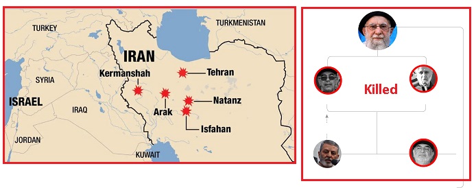 По данным иранских государственных СМИ и официальных лиц, израильские удары нанесли серьёзный удар по военной иерархии Ирана, убив по меньшей мере шестерых высокопоставленных генералов, а также высокопоставленного политика и по меньшей мере пятерых учёных-ядерщиков. В субботу иранские военные подтвердили, что с начала ударов в пятницу были убиты ещё два высокопоставленных военачальника. Верховный лидер Ирана аятолла Али Хаменеи быстро принял меры по замене военных руководителей, очевидно, стремясь продемонстрировать стабильность и предотвратить вакуум власти. Иранское правительство заявило, что в субботу были убиты ещё три учёных-ядерщика: Али Бакаи Карими, Мансур Асгари и Саид Борджи. Доктор Бакаи Карими был убит вместе с женой и двумя детьми.