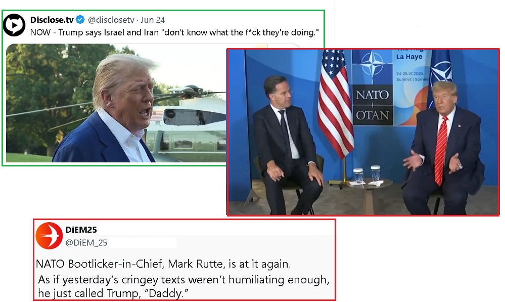 - Президент Дональд Трамп недавно встретился с генеральным секретарём НАТО Марком Рютте, который подвергся критике за лесть и похвалу в адрес Трампа на саммите НАТО, состоявшемся на этой неделе. Обсуждая продолжающийся конфликт между Израилем и Ираном, Трамп сказал: «Они не собираются воевать друг с другом. С них хватит. Они устроили большую драку, как два ребёнка на школьном дворе. Знаете, они дерутся как сумасшедшие. Их не остановить. Пусть дерутся две-три минуты. Тогда их будет легче остановить». А потом папе иногда приходится использовать крепкое словцо, — сказал Рютте, подняв кулак и громко рассмеявшись.
