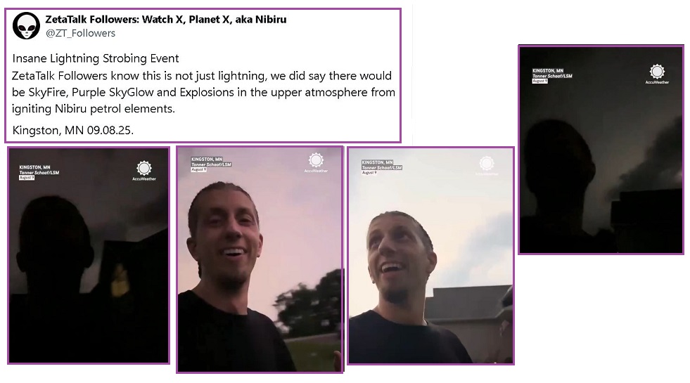 Мы ожидаем, что Нибиру заявит о себе увеличением количества горящих нефтяных капель, падающих с неба и часто вызывающих пожары. Это приведёт к небесному свечению, когда небо будет ярким от горизонта до горизонта, даже на ночной стороне земного шара. Это будет сопровождаться низким стонущим звуком, похожим на туманный горн, вызванным вибрацией верхних слоёв атмосферы, где нефть впервые встречается с кислородом и может воспламениться. В качестве примера можно привести стробоскопическую молнию, которая возникла в Миннесоте 9 августа. При этом не было ни грозы, ни облаков.