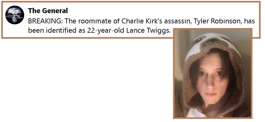 - Этот человек, личность которого власти пока не раскрывают, теперь полностью сотрудничает с ФБР в расследовании убийства консервативного активиста. Согласно общедоступным данным, 22-летний Лэнс Твиггс проживал по тому же адресу, что и Робинсон. Родственник Твиггса подтвердил, что «да, они были соседями по комнате».