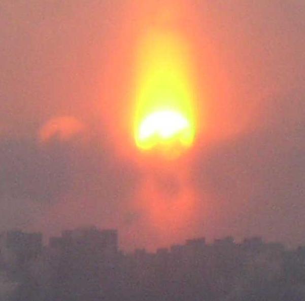 Note appearing behind clouds on the left, so not a lens flare, with another appearing directly beneath the Sun. The Monster is a bent light persona, not the true size or location of Planet X. The Sun is also stacked, an elongated Sun.