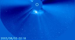 I have watched Lasco and Soho for over two years now and have grown acustomed to various types and strengths of flares. This is where I become firm that this is no flare. Study this Frame in any photo or graphics software you have on your computer. This looks more like a big van burning oil, not the expected explosion that one would expect if the bright center was just stellar material. In the first frame [01:42], a body emerges into view , here it is clear there is a brigh luminous center even if one believes this is only a CME. In the next frame [02:18] it is even clearer that the matter that surrounds the body in question in this event is trailing the object and not showing proper relation to the sun as do most flares. In the last two frames [02:42 and 03:18] I see more evidence the matter surrounding the object is trailing it some distance as is observed by the tail end coming out atop the occulting disk, whether this is behind the sun also I cannot say. If this was a CME the tail end of the long tail would have to result from a flare atop the sun from this view. I have seen a flare look like that in size/brightness and range. [But] it’s Identical to the matter surround the bright star like body and goes in a nice long declining trail that starts to give a good 3D reference to this object and it's company.