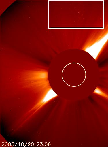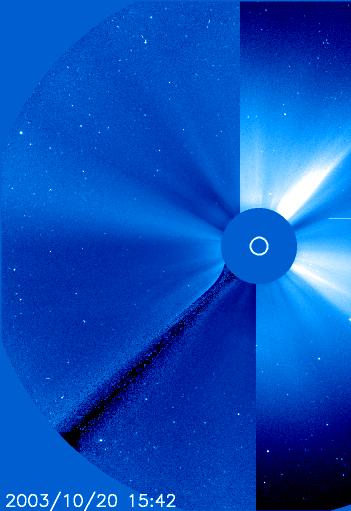 Debris cloud. Compare to a web cam of the night sky from Denver, CO. taken the a few hours later. Note that SOHO felt the need to do a poor cut-n-paste job also, covering this area.